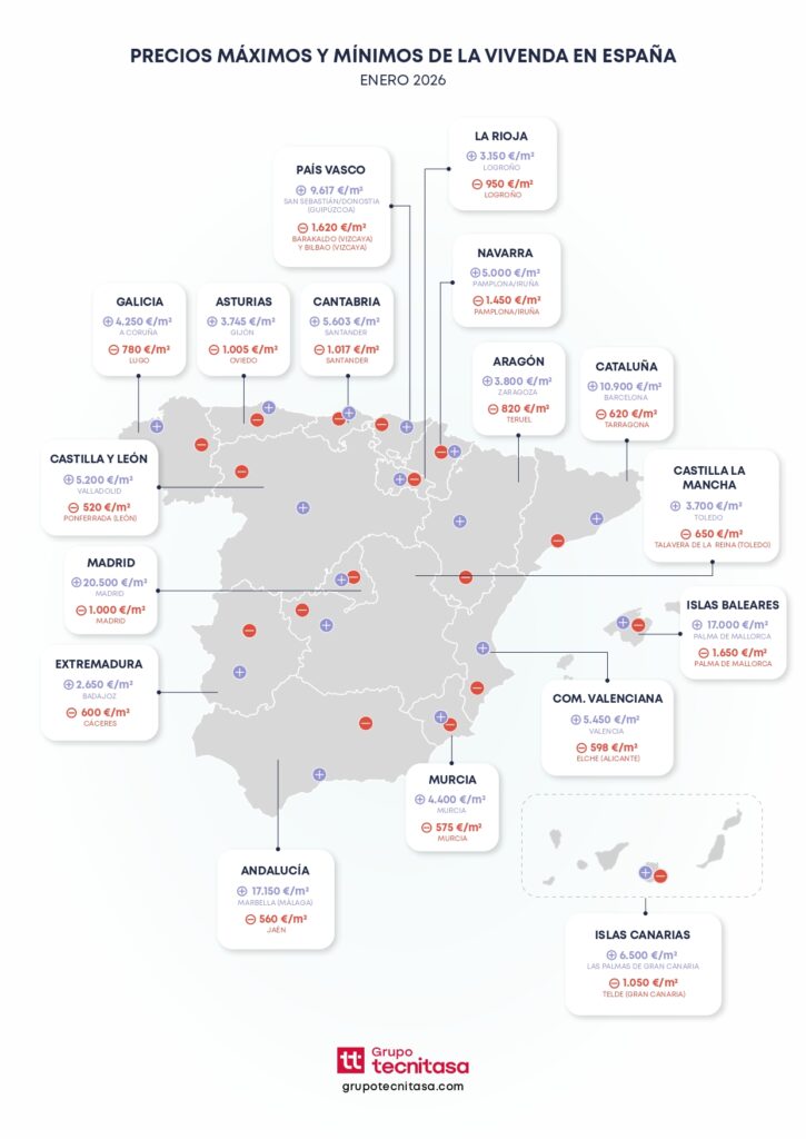 El mercado residencial español ha vuelto a registrar valores récord. Así lo refleja nuestro Informe de Precios Máximos y Mínimos de la Vivienda 2026, elaborado con datos de Grupo Tecnitasa, que analiza la evolución del precio del metro cuadrado en las capitales de provincia y en las principales localidades españolas.